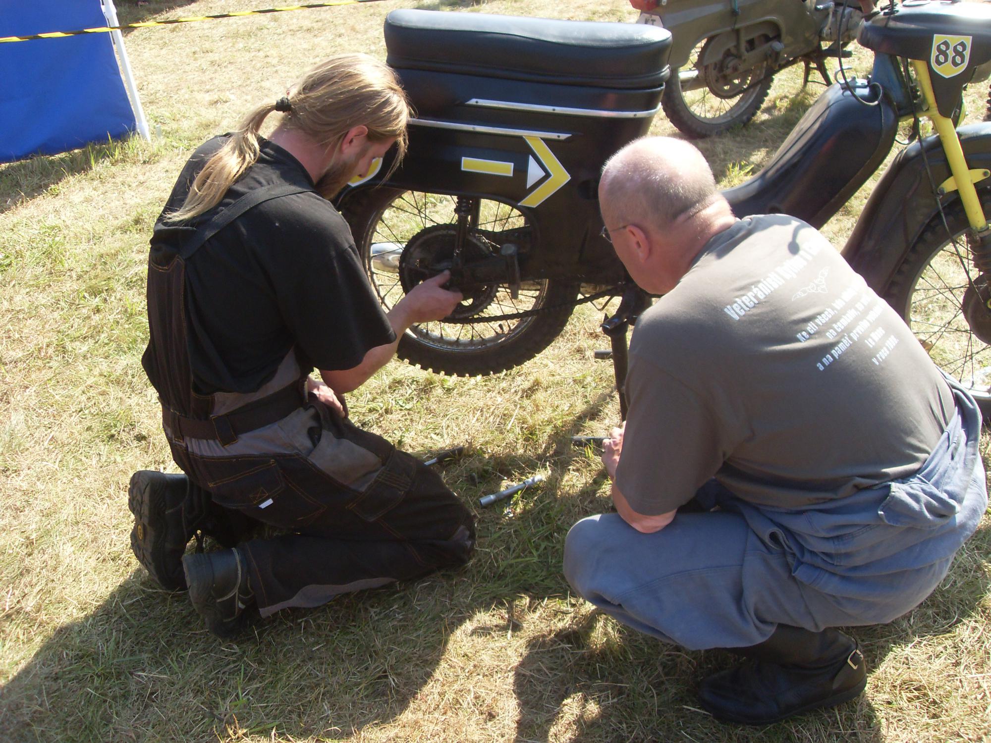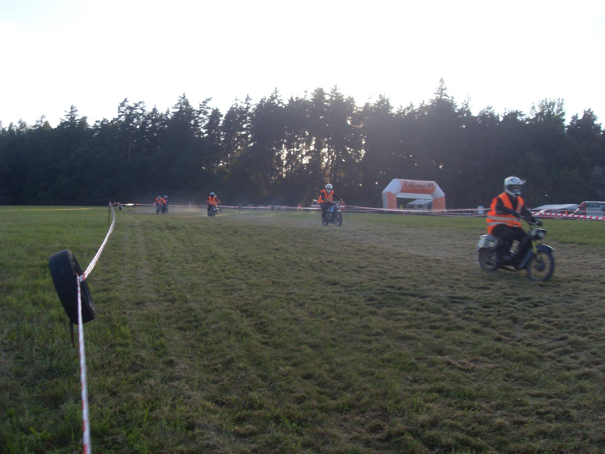 Veteránisti Kytína a Chouzavé uspořádali ve dnech 13.-14. srpna 24 hodinový závod ke cti všem, kteří někdy závodili na čemkoliv, co vrčí, a na paměť prvního velkého závodu v Le Mans v roce 1906. Byl to již druhý ročník, první byl před deseti lety ke 100. výročí nejslavnějšího závodu. O prvním ročníku jsem se dozvěděl až zpětně a velmi jsem litoval, že jsem se nezúčastnil, proto, když jsem se dozvěděl o letošní jízdě, tak jsem věděl, že musím jet. Přihlásit se mohly týmy o šesti jezdcích s jedním mechanikem a maximálně třemi motocykly o maximálním obsahu 50ccm. Startovalo se ve dvou kategoriích a to standart a upravené stroje. Dal jsem dohromady tým ze 3 členů našeho klubu a tří kamarádů. Porušil jsem slib, že dvoutakt mi nesmí do baráku, zakoupil Jawa 21, zrenovoval ji, udělal stejný dyzajn na všechny 3 stroje a mohli jsme vyrazit. Bohužel jeden stroj měl doma v den startu havárii a majitel skončil v nemocnici, bohužel i jeho syn se poté rozhodl, že se závodu nezúčastní.Tak jsme se v depu sešli ve čtyřech s dvěma stroji.Start byl hromadný stylem Le Mans, jezdci na jedné straně a nenastartované stroje na druhé V sobotu 13. ve 13 hodin a 13 minut. Za naší Stíhací eskadru JG 88 startoval Kamil. Fantastickej start a na prvních 50metrech jsme vedli. Startovalo 16 týmů, z toho dva týmy francouzské, 13 týmů v kategorii standart a 3 s upravenými stroji. Zvlášť se musím zmínit o Manet týmu složenému z 3 jezdců na dvou strojích. Manet má pevnej zadek a nemá ani pružení v přední vidlici. Smekám před panem Hošťálkem, který ve svých 74 letech absolvoval na tomto stroji svou část závodu. Okruh s několika zatáčkama v délce necelého kilometru se jel na svažité louce. První pády, první opravy a už jsme věděli, že tohle nebude sranda, ale perná dřina. Začalo to ohnutou řadicí osičkou. Rychle do depa. Přehodit zakódovaný čip, který měl každý tým jen jeden a počítal nám ujetá kola, na druhý motocykl a hurá na trať. Rozborka, oprava a už přijíždí motocykl s uraženou stupačkou. Přehodit čip. Oprava. Dá se říct, že 50% času v depu se pracovalo na opravách. Dařilo se nám stále držet jeden stroj provozuschopný, jen asi 15 minut byly oba stroje nepojízdné. Musím říct, že v depech panovala kamarádská atmosféra a nebyl problém kohokoliv požádat o pomoc, když měl náhradní díl, který jste potřeboval, tak vám ho dal i když ho později mohl potřebovat sám. S postupujícím časem se přestalo padat, ale začaly se projevovat únavy materiálů. Pak přišla noc. Trať byla sice kvalitně nasvícena, ale časy se mírně prodloužily. Noc byla dlouhá. Ráno. Rosa na trávě. Pády. Neskutečná únava. Vyčerpání. Modlíme se, aby už bylo poledne. Stroje stále udržujeme v provozu. Průběžně sledujeme pořadí. Z 10. místa se nám podařilo vypracovat až na 5., ale to jsme neudrželi a pohybovali se okolo 7. Únava, Rezignace. Furt jedeme. V půl jedenácté praskají dráty v zadním kole. Už neopravujeme a doufáme, že druhý stroj vydrží. A vydržel. Neděle 14. 13 hodin 13 minut. Šimon projíždí cílem. Celkově jsme skončili na 8. místě. V kategorii standart na 7. Jsme šťasní. Všichni sice ríkáme "už nikdy víc", ale kdo ví.