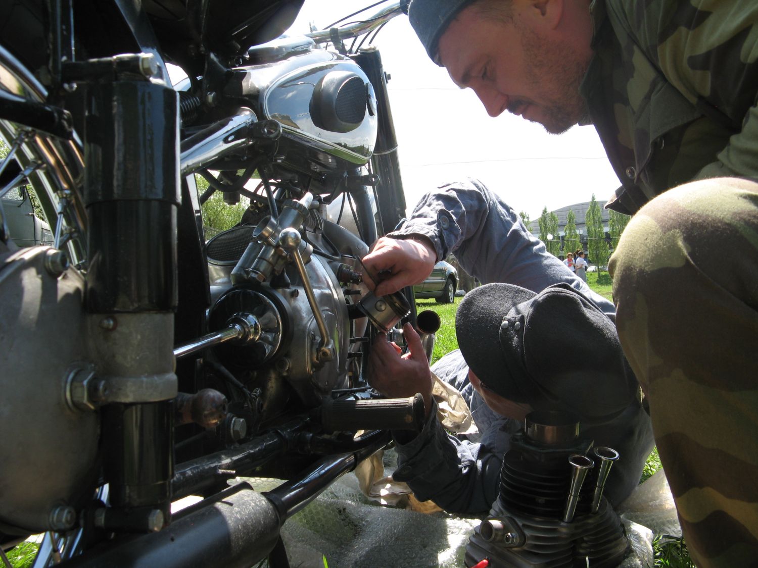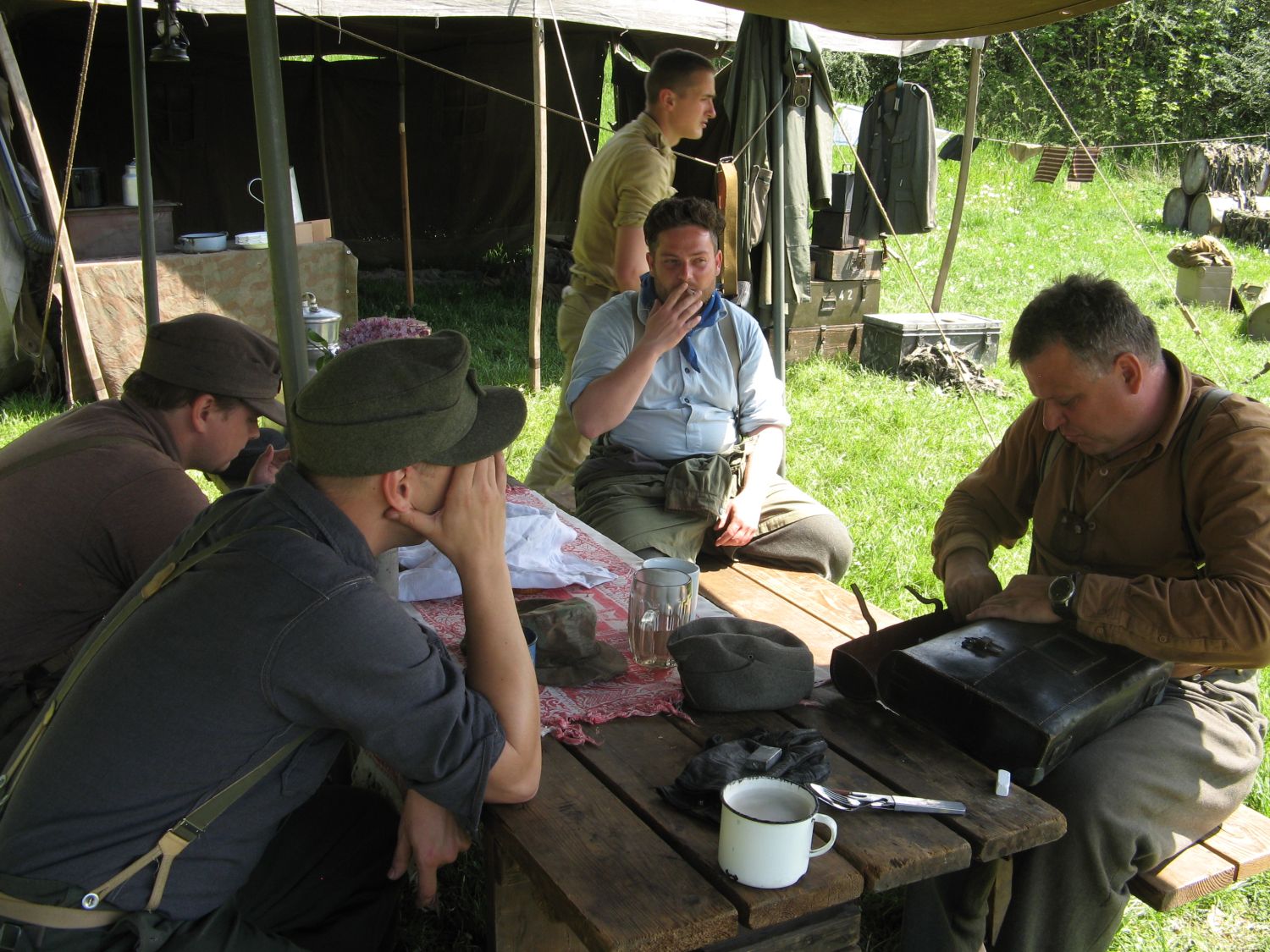 Na pátek 8.5. byl náš klub požádán o spolupořádání oslav 70. výročí konce války v Berouně. Tábor jsem začali stavět už o den dříve ve čtvrtek, abysme byli připraveni na páteční ráno kdy měla akce oficiálně začít. Kromě německého tábora, kde mohli navštěvníci spatřit malou výstavku výsadkářského vybavení, několik kusů techniky, od moterek přes automobily po originální dřevený povoz pro koně, zde dělali výstavu také kluby reprezentující americkou a sovětskou armádu. Nejvetším lákadlem pro malé kluky byl zřejme tank T-34/85, který byl obletován fotografujícími rodiči. Při přesunu techniky se nám na BMW R-51 přidřel válec a tak mohli být diváci svědky výměny pístních kroužků a přetěsnění válce přimo na louce. Celý páteční den doprovázel kulturní program s hrajícími kapelami a ukázkou techniky. Po ukončení akce jsme trochu zaklubařili s "nepřítelem" a v sobotu ráno vyrazili po umorném balení směrem k domovu. Počasí krásně vyšlo a akce byla podle nás velmi podařená.