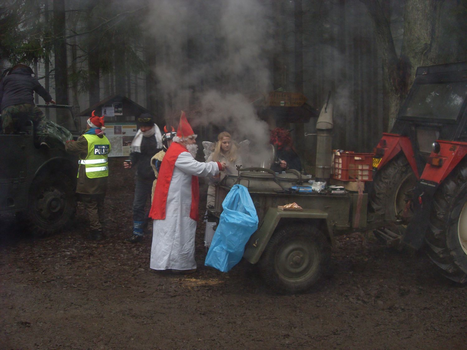 Letos se po roční pauze (loni se v termínu mikulášské jízdy pořádal hon na přemnožená prasata) opět konala mikulášská jízda, pořádaná Veteránisty Kytínu a Chouzavé v Brdech. Z našeho klubu se zúčastnila R12 sólo a R75. Sraz byl 6.12. v 8:30 v Kytíně, a odjíždět se mělo v 9:00 hod. Na sraz jsme dorazili v 9:05, a na shromaždišti byl jen traktor s polní kuchyní, která vařila tradiční mikulášský čaj. Jeden z našich členů, který jezdí na srazy do zahraničí, začal trochu zmatkovat, že nám již všichni ujeli. Ale po domluvě s obsluhou polní kuchyně jsme se dozvěděli, že včera měli místní důležitou pracovní schůzku v restauraci, a že se porada protáhla do pozdních nočních hodin, a na srazu jsme první. Takže okolo 9:30 se začali sjíždět motocykly rozličných značek řízené čerty, Mikuláši, anděly a něčím, co mohlo být Santa Klaus nebo děda Mráz (nepoznám rozdíl). Přijelo i několik dvoustopých strojů, z nichž byl nejzajímavější prototyp průzkumného pásového vozidla cca z r. 1955 poháněného motorem z brouka. Ten byl velmi nízký, a původně v něm posádka ležela na břiše, tak že by mohli podjet i závory na Rozvadově. Zdejší model byl pro sedící posádku, ale to mu neubralo na zajímavosti.