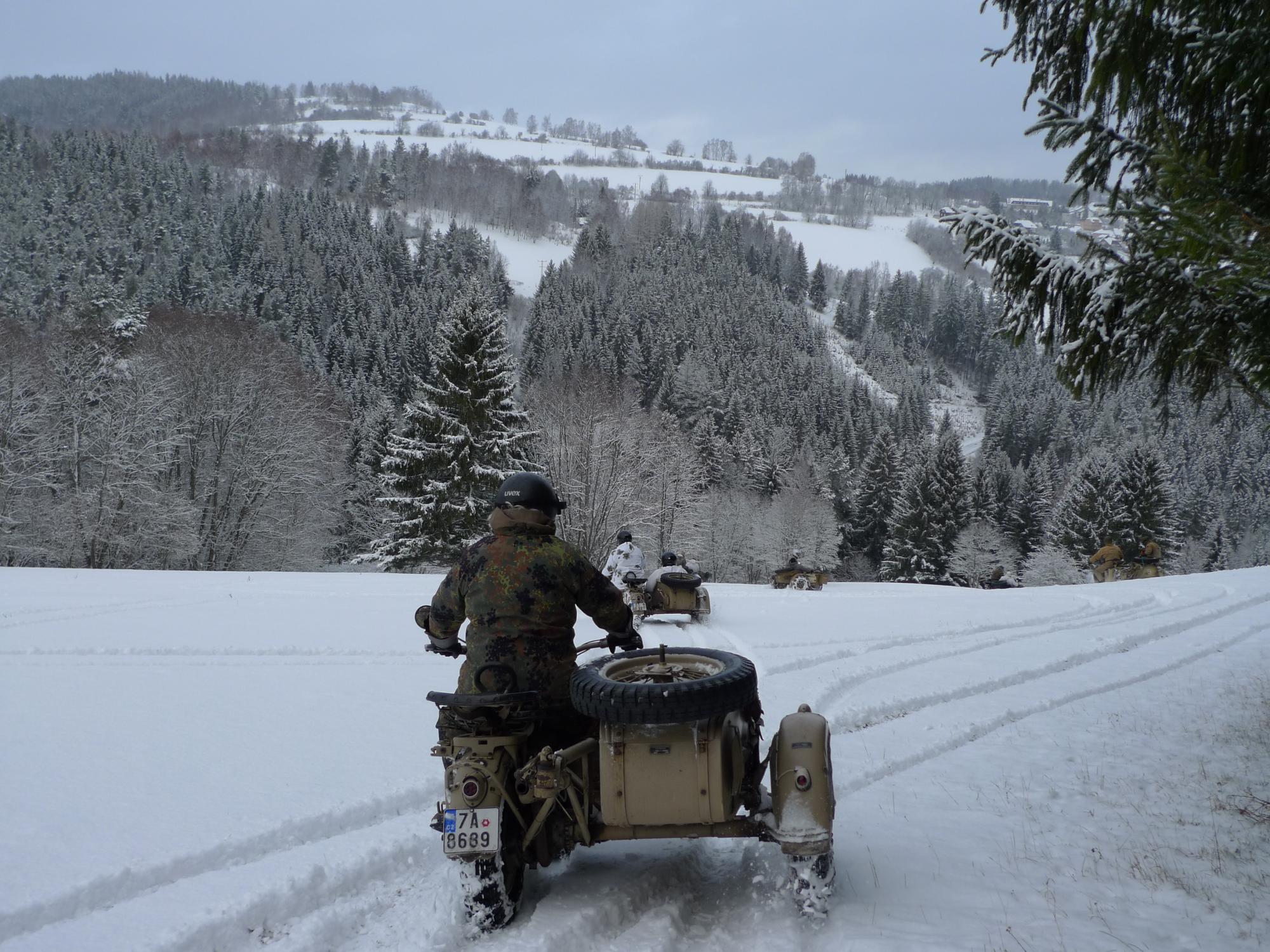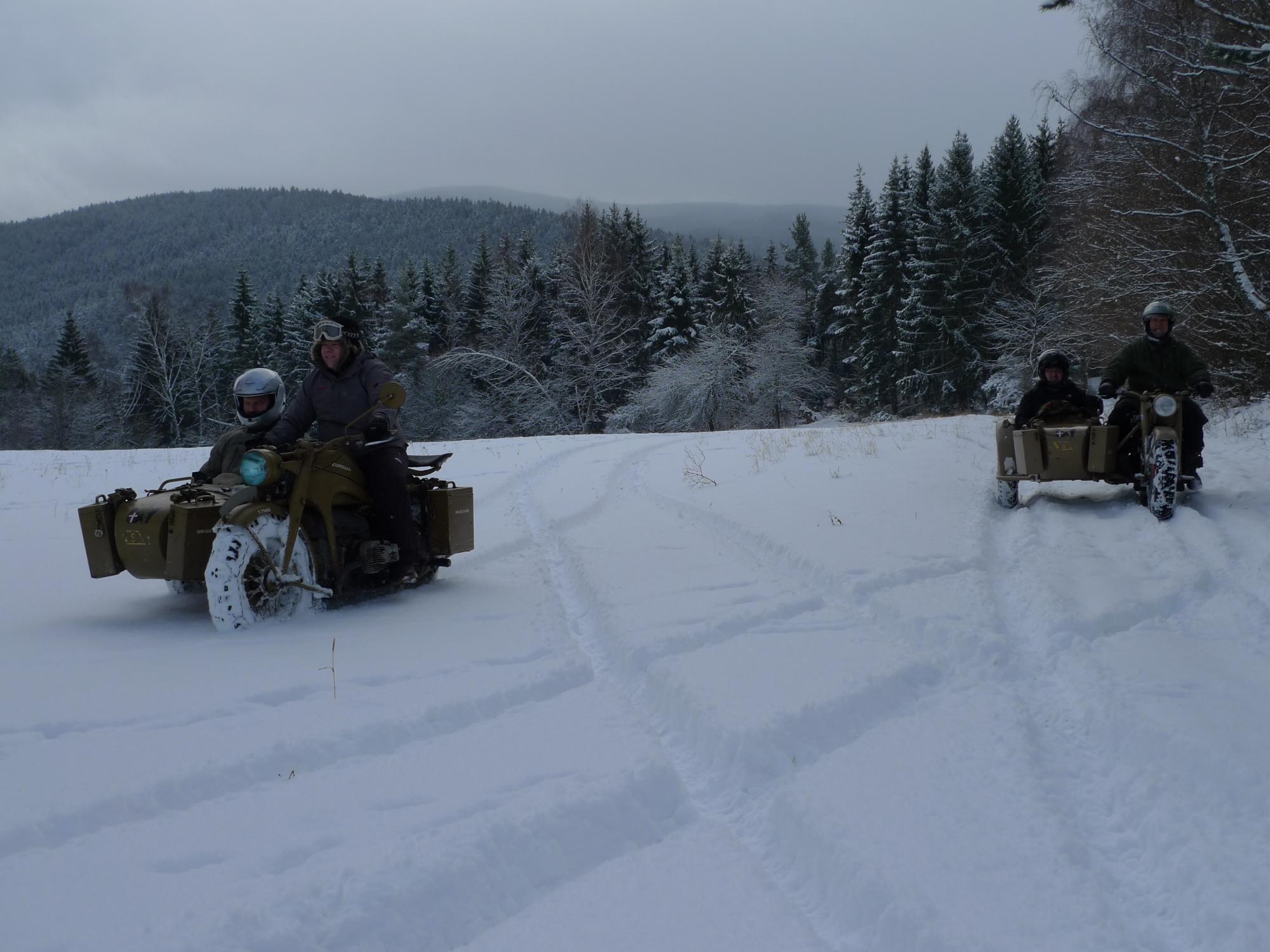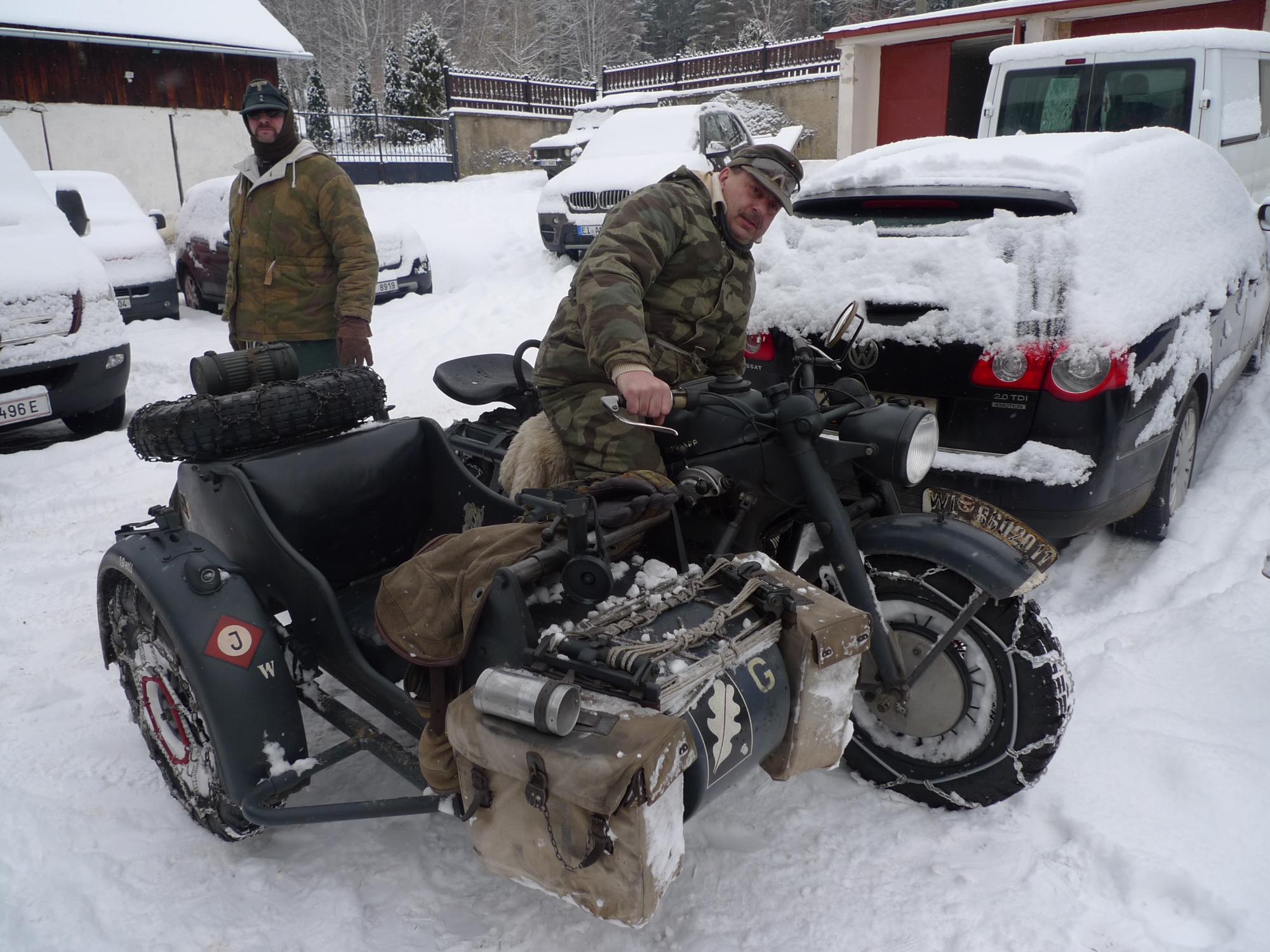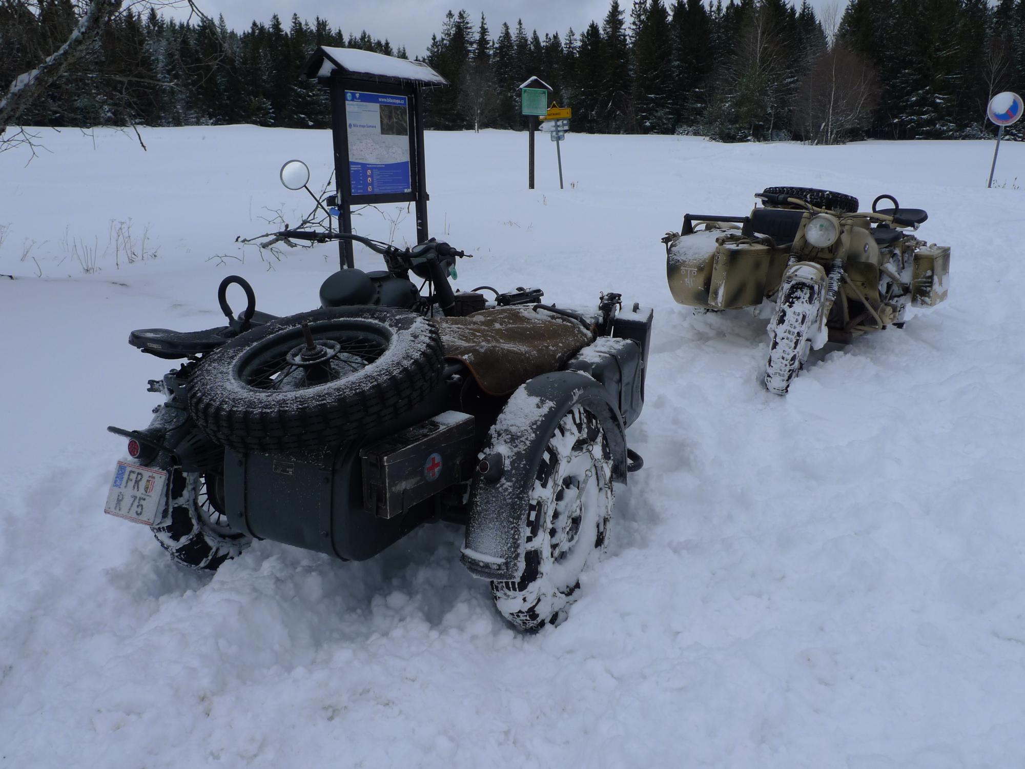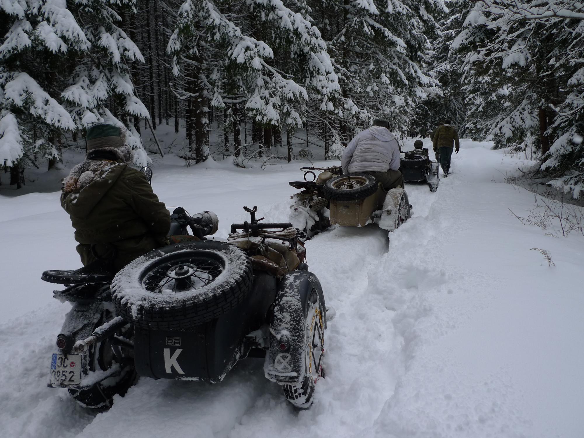 14. ročník „Sněhuláka“ se konal od 18. – 21.1.2018, necelý týden po akci Skischule. Někteří tento časový úsek pojali jako zimní dovolenou, spojili tyto dvě akce do jedné a užívali si krás Šumavy. Jak už je zvykem, byť má Schneemann jasně daný termín, účastníci se sjížděli už od úterý, nikoli až od čtvrtka. Na Kaiserhof se sjelo slušné množství strojů včetně našich přátel z Rakouska. Jestli jsem to dobře spočítal, 7 strojů BMW R75, 5 strojů Zündapp KS750 a 1 stroj BMW R12. Vyhlídka na ideální sněhové podmínky nebyla dobrá a hlavní pořadatel se rozmýšlel, zda akci neodvolá. Avšak příroda se umoudřila a už na čtvrtek se z oblohy začal sypat sníh, a to vydrželo až do neděle. Na první projížďku měly všechny stroje nasazené řetězy, výjimkou byla R12, ta měla pneumatiky s hřeby. Páteční vyjížďka byla jak je zvykem kratší a probíhala v bližším okolí ubytovacího zařízení. V moderní terminologii by se dala nazvat prologem. První den zprostředkoval účastníkům oživení návyků při vedení stroje ve sněhu. V sobotu ráno jsme všichni natěšeně koukali z oken „Kaisru“, jak krásně padá sníh a podmínky budou ještě lepší než den předešlý. Pan vedoucí seřadil stroje, přerozdělil „mitfáry“ a hurá na zasněžené cesty, louky a do lesů. Dopolední úsek byl delší a s malými přestávkami jsme si všichni užívali nádherné chvíle, a na vlastní kůži pociťovali, co tyto přes 70 let staré stroje dovedou. Zhruba ve 14 hodin nás čekal oběd v již pro tuto akci tradičním stravovacím zařízením. Odpolední vložka byla kratší, ale prověřila nejen stroje, ale i nás. Před šerem téměř všechny posádky dorazily do cíle. Jediným strojem, který nedokončil, byla R12, té vypovědělo službu magdynamo. Večer jsme si poslechli od „největšího odborníka na druhou světovou válku v ČR“, jak se sám nazval, přednášku o Kurtu Knispelovi, německém tankovém esu druhé světové války. Plni zážitků jsme nejen o této akci diskutovali do pozdních večerních hodin. V neděli už byly stroje na podvalech i v dodávkách a směřovaly domů. Tahle akce je prostě pecka! Kdo nezažil, nepochopí……..